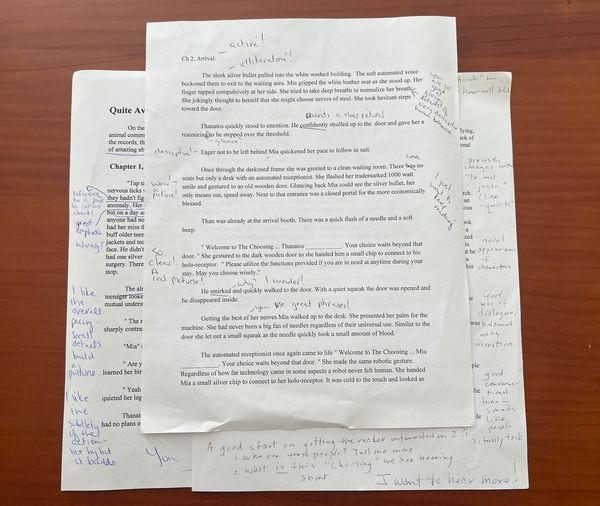 In this image, you can see the physical evolution of my story. These rough drafts bear the marks of my creative process. The handwritten comments in the margins are invaluable feedback from mentors who guided me along my writing journey.